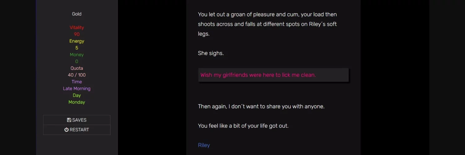 Its my first game . I need a lot of feedback since I do not have anyone to try the game. If you feel the game too grindy, just cheat it. It is easier to reach the contents, make the "money" , "RileyLove" , "sashagreylove" , "sashagreyscene" as high as you want.
