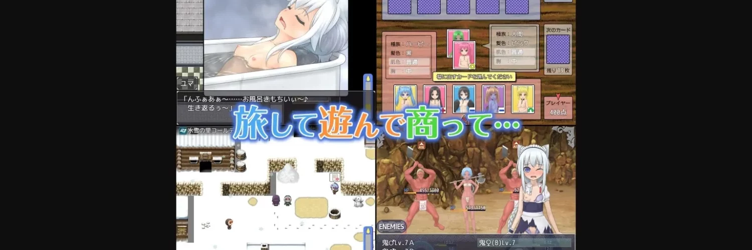 2D game, 2DCG, Female protagonist, Male protagonist, Multiple protagonist, Fantasy, Violation, Animal aars, Big Tits, Tiny breasts, Humiliation, Slave, RPG, Turn based combat, Vaginal sex, Teasing, Internal view, Prostitution, Urination, Scat