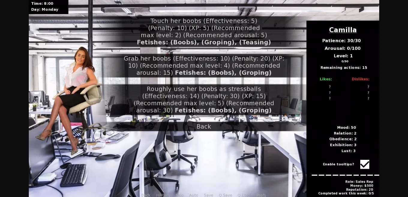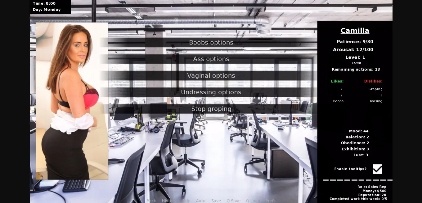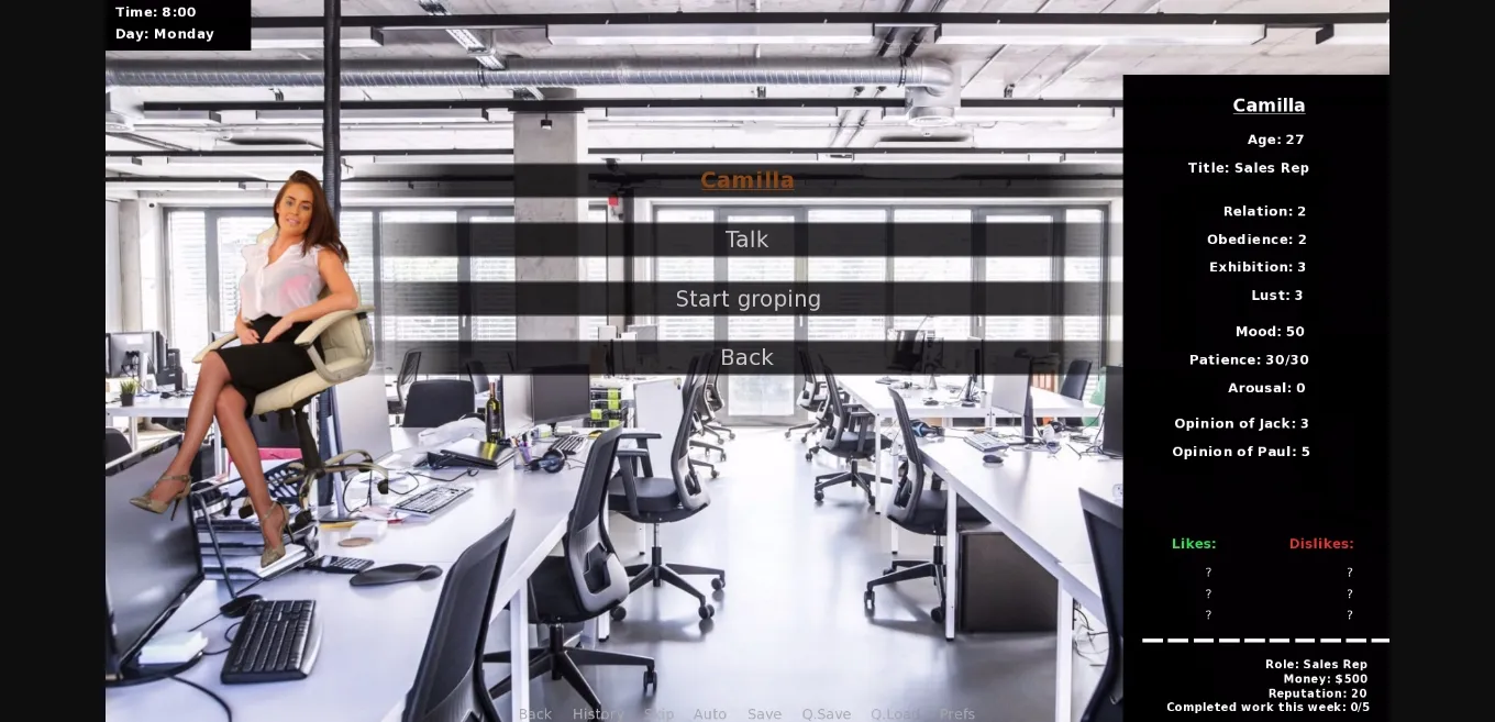 You, the protagonist, is a new employee of an office. Here you will meet your new colleagues, and have your way with them. For now, the game is in a very early stage of development, and could be considered as a proof of concept rather than an actual game in its state.