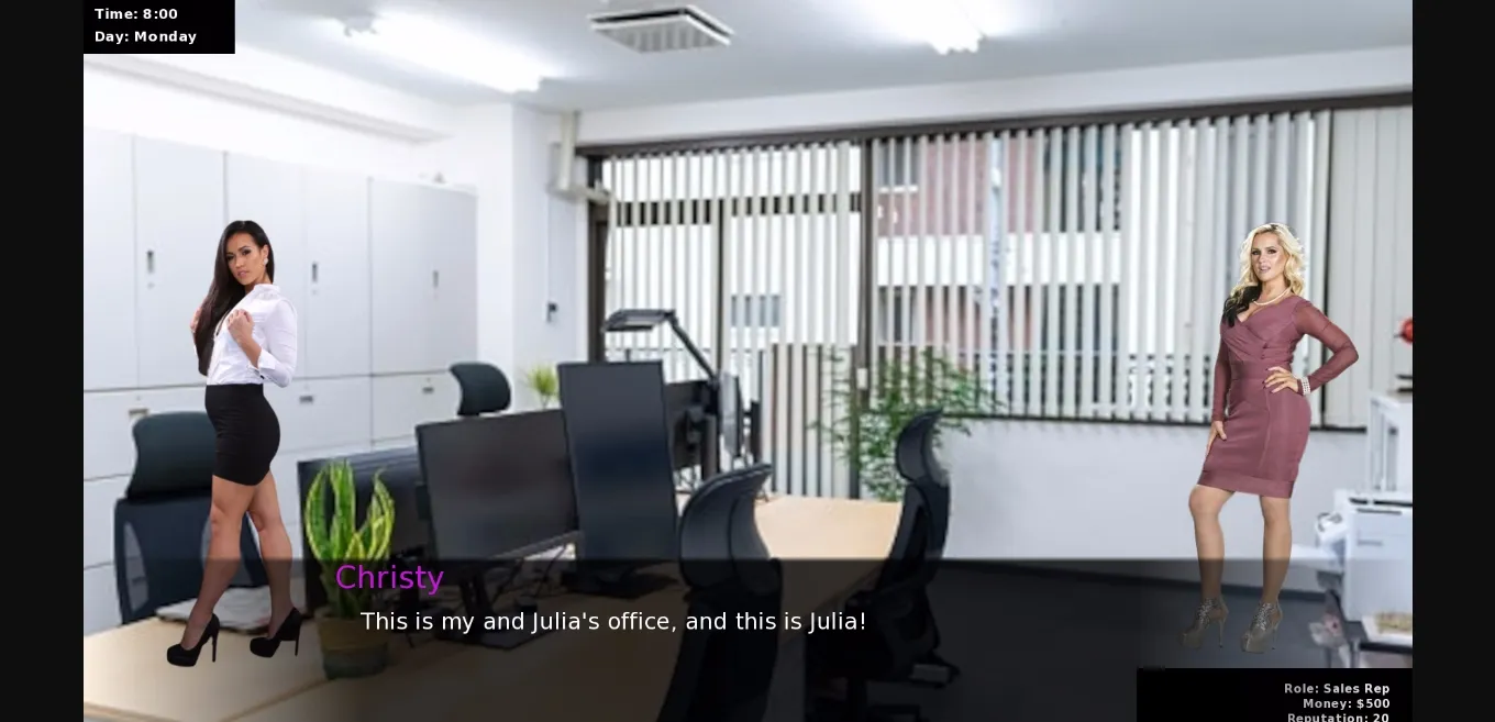 Become Boss is a sandbox/slightly story and quest based office sex & groping simulator game with RPG elements, built in RenPy… Wow that is quite a mouthful to say.