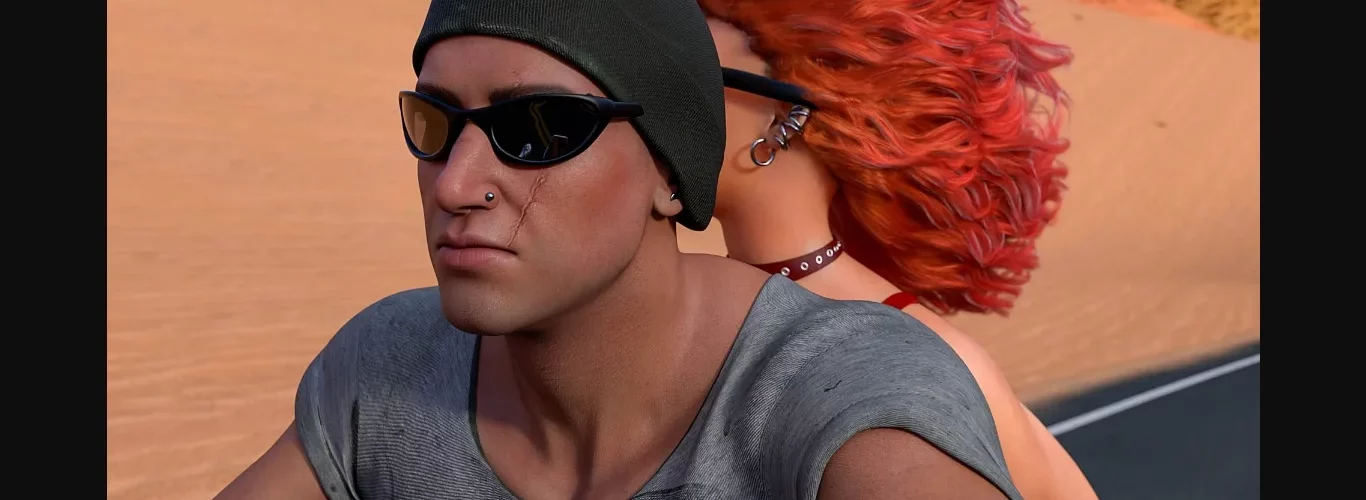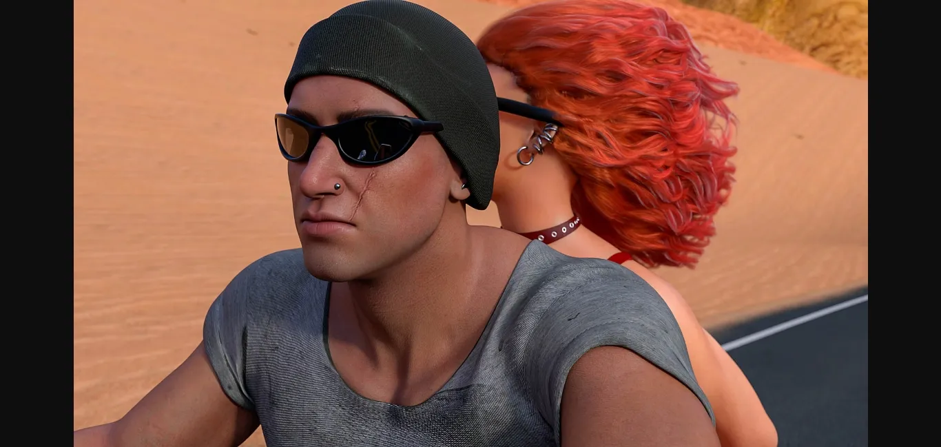 What is that hot redhead doing racing thru the desert, all but naked, on the back of a motorcycle?