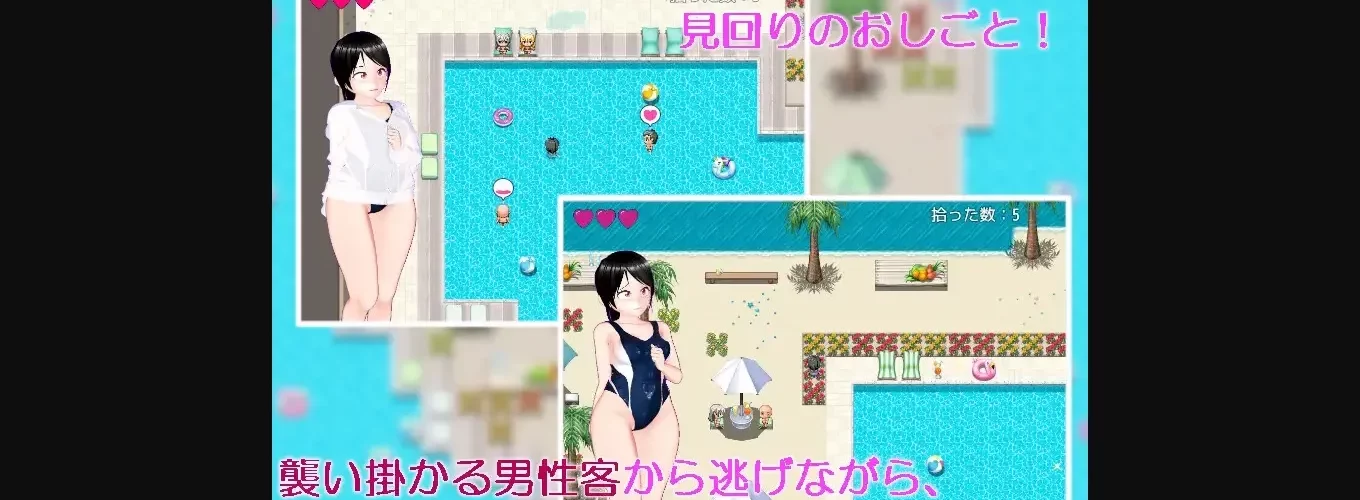 As a staff member at a leisure pool, your job is to pick up lost items around the park while avoiding male customers who may attack you upon discovery. This game has a simple gameplay similar to the previous version.