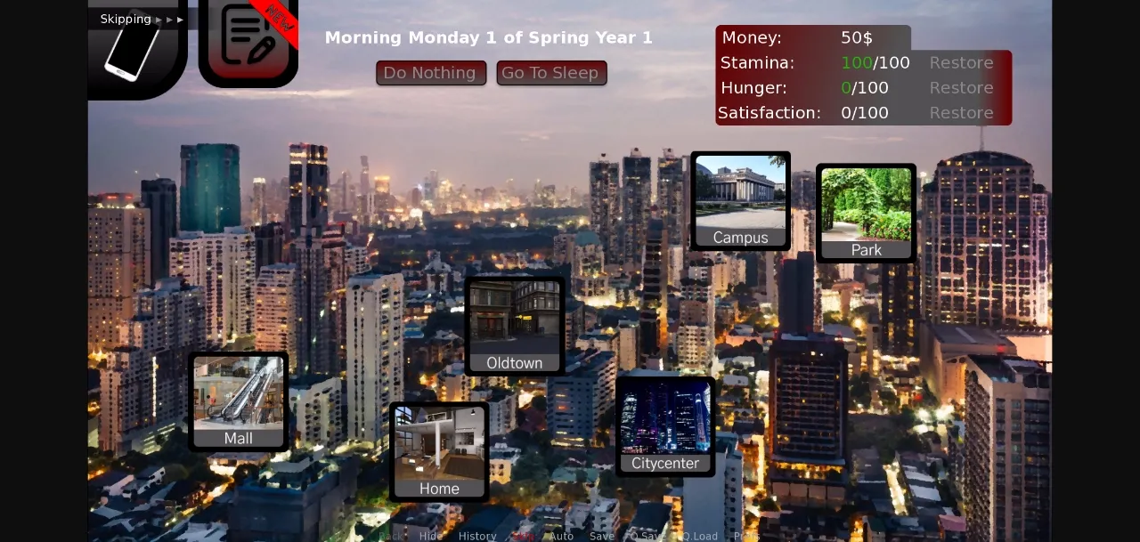 It is a dating sim where you have 4 resources to manage: Money to buy stuff! Hunger and Stamina to make you spend a part of it! And Satisfaction to upgrade your skills!