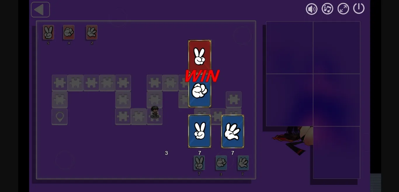According to the remaining number of cards in the upper left corner, guess the card that your opponent will play and beat them to get the character tokens. Once all the tokens are obtained, the character will be unlocked. The difficulty will increase as the game progresses
