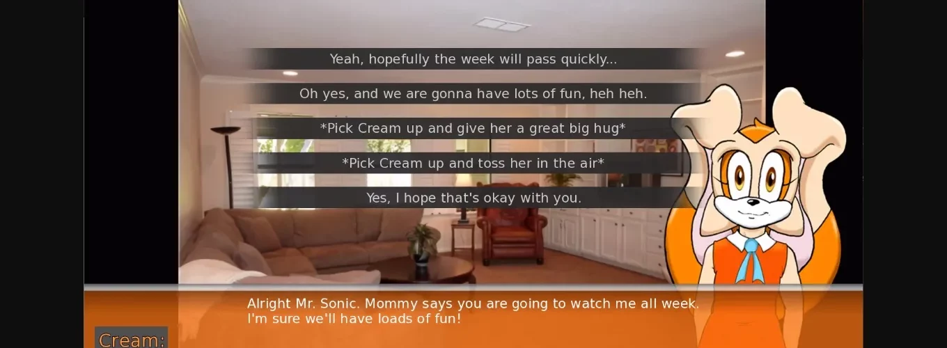 The player takes the role of Sonic the Hedgehog, whose across-the-street neighbor, Vanilla the Rabbit, has a huge favor to ask: she needs to go away for a week and can’t take Cream with her. Amy is busy this week. Would Sonic babysit Cream? She gives him the keys to the house, and money for expenses, promising both Sonic and Cream "BIG" rewards when she returns.