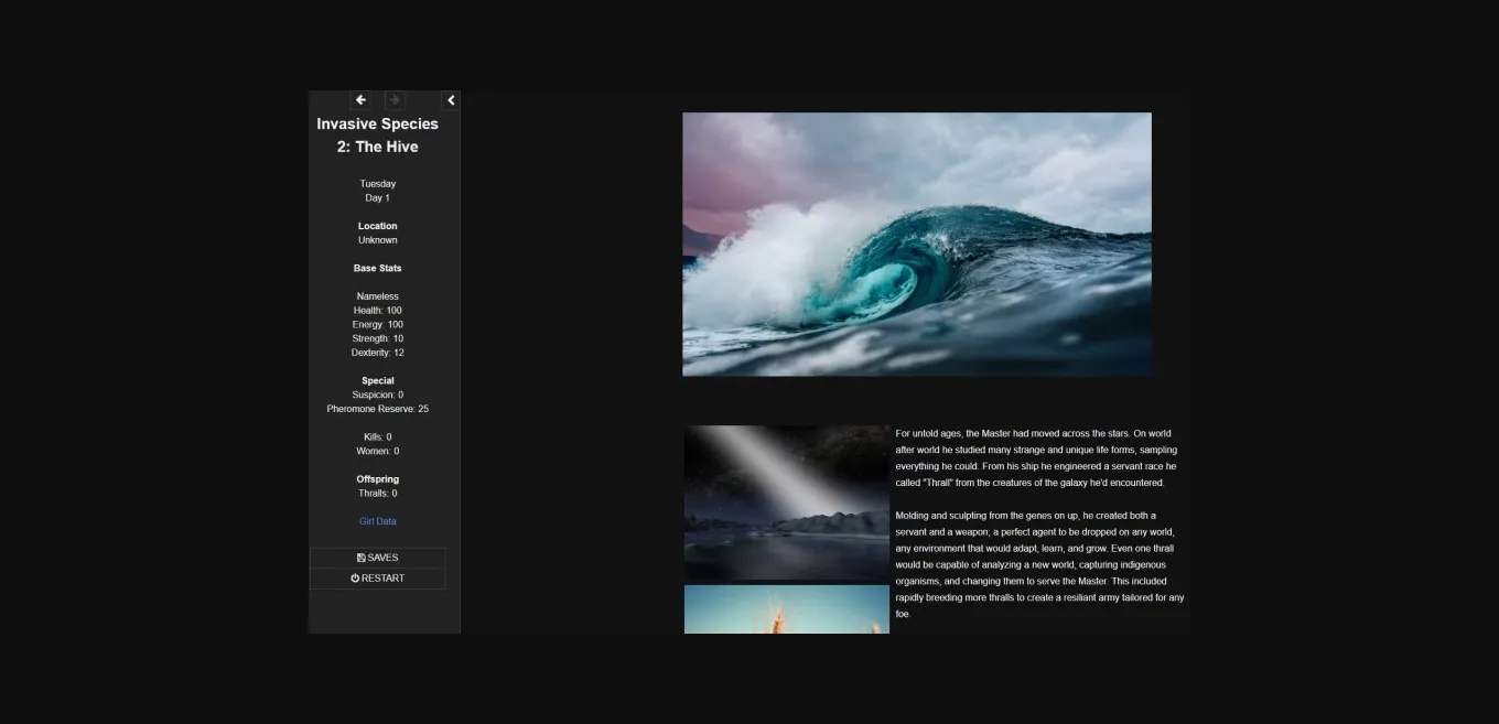 You are a Thrall; an alien creature engineered for infiltration and complex tasks at the behest of your master. You’ve been dispatched to Earth, the Master’s favored hunting grounds, to establish a hive of humans you must indoctrinate and breed to produce minions of your own. With your forces, you will gather resources to improve your position, improve your hive building craft, and investigate what alien influence has recently come to Earth and is stealing the Master’s favorite source of new breeders.