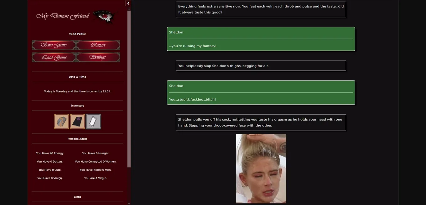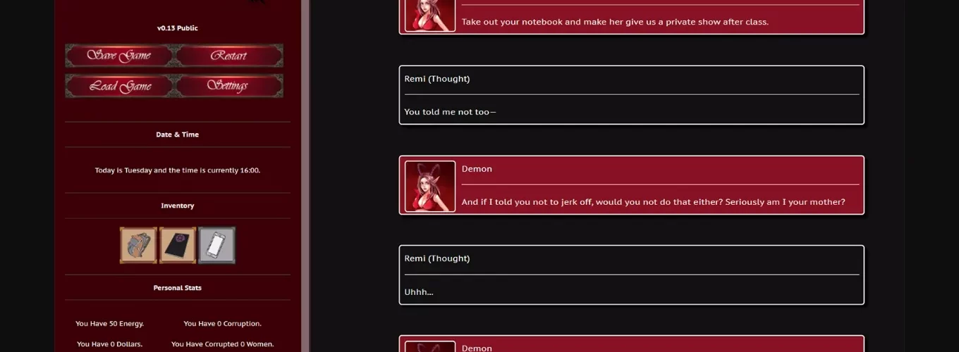 My Demon Friend is a text-based fantasy game with a school setting and emphasis on player choice. It features a male or female protagonist, optional transformation themes, and a variety of characters with different storylines, personalities, and romance options.