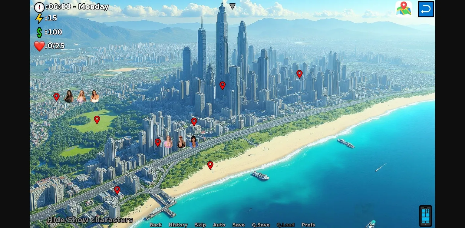 - Top Left: Main stats (Money, Arousal, Energy)