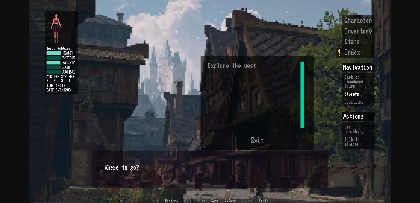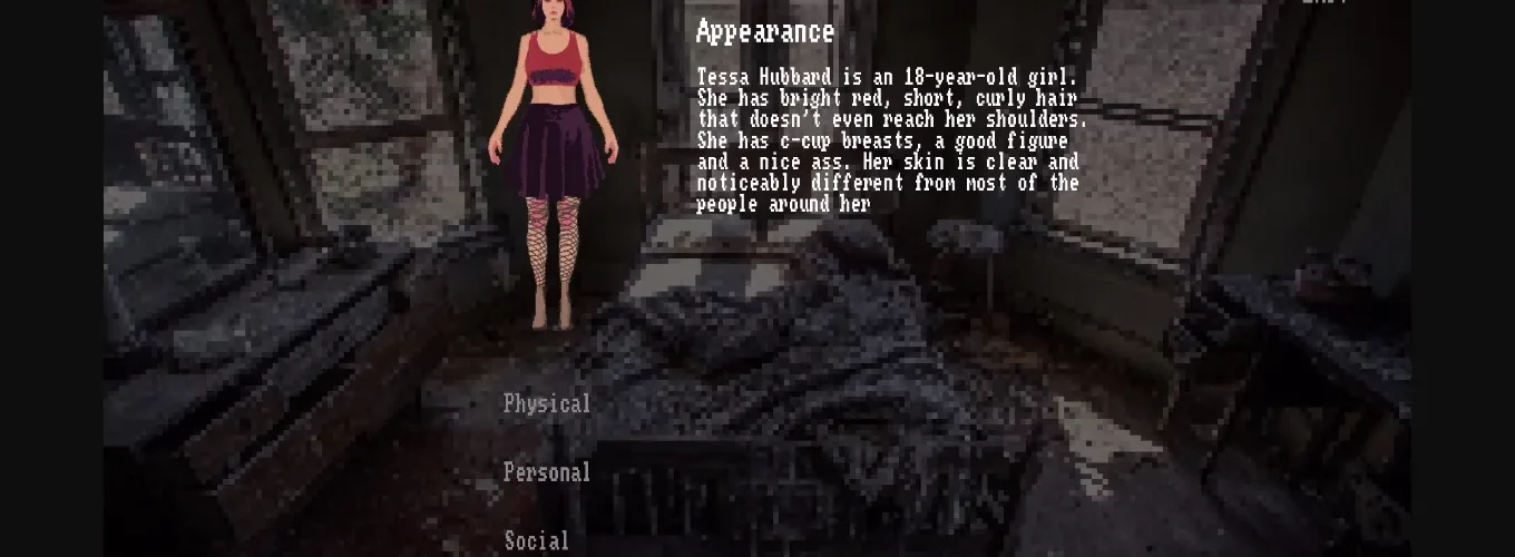 various character stats have been added. open stats display Tessa’s abilities in certain directions, while hidden stats affect your character’s behavior, events around her, and your character’s stats, displayed in the status window; - night and day system;