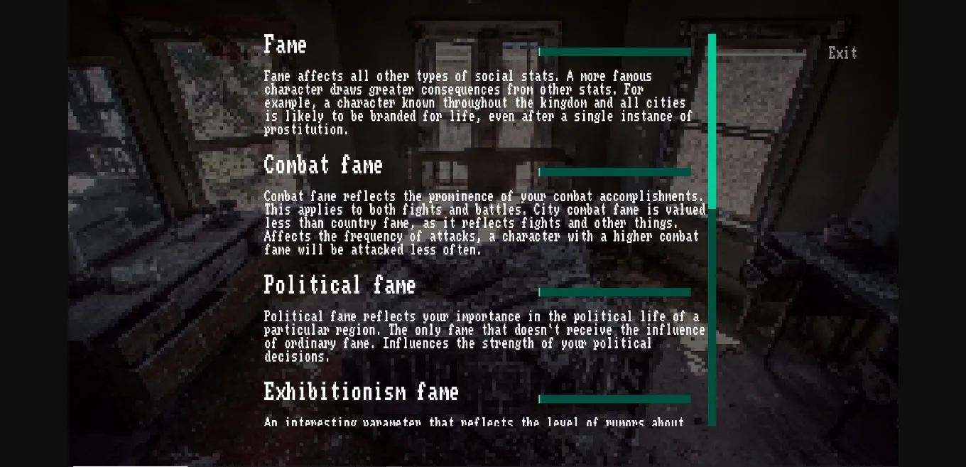 in addition to appearance, the character now has a system of statuses that affect the gameplay. some statuses temporarily change stats, some statuses increase the chance of certain events and so on; - fame system added