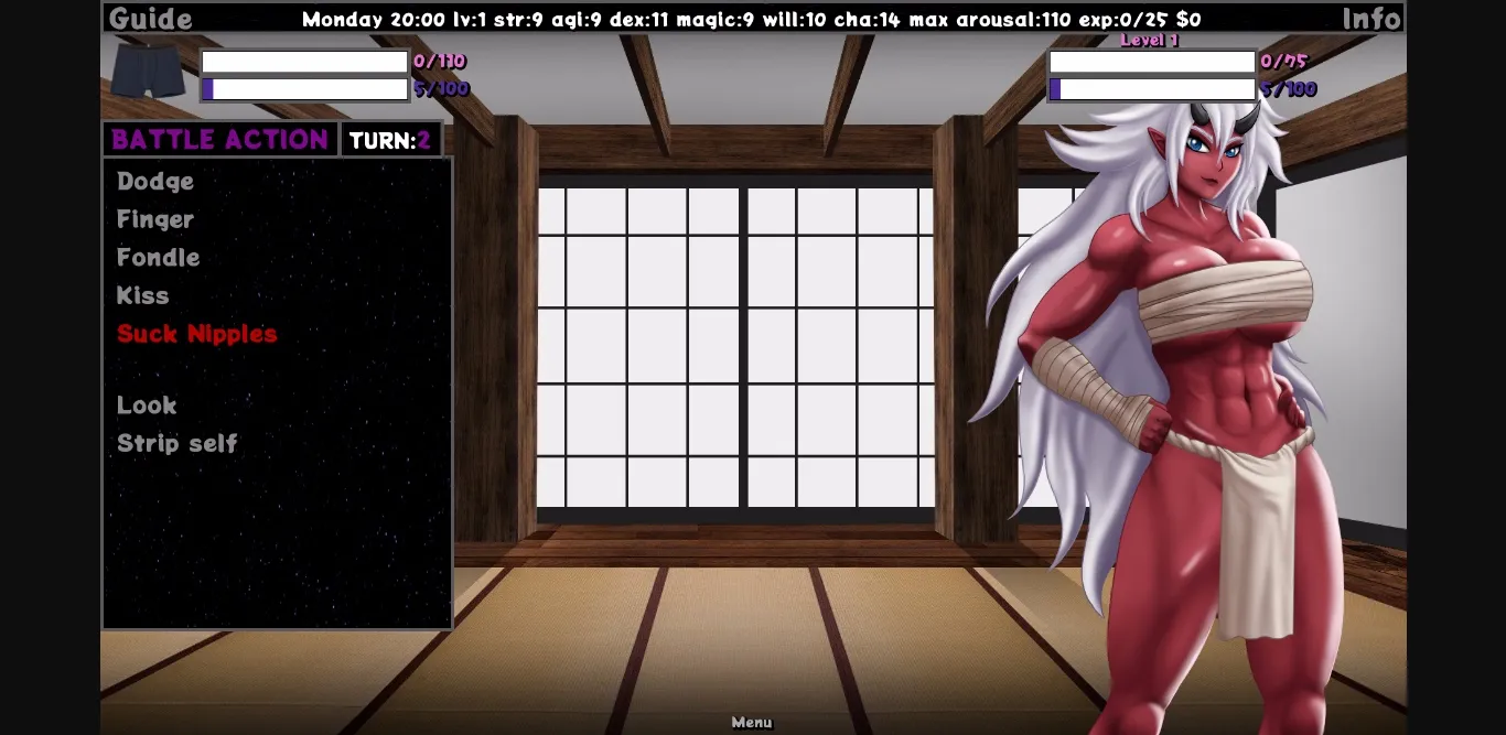 The game is text-based with 2d cgs of the characters. The base of the game are the sexfights were you will fight against the girls trying to undress them and make them cum before you. You will also be able to visit them in their worlds were you can find out more about them and do all sort of activities to improve yourself, get closer to the girl and sometimes eventually make a difference in their worlds. But don’t feel too safe there is more to those games then it seems and it is up to you to find out, your own life may depend on it.