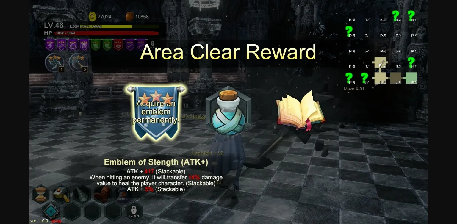 The Maze is generated randomly. You will be rewarded after beating each cell in the maze. The rewards are Skills, Items, Emblems, Gold, and Exp.