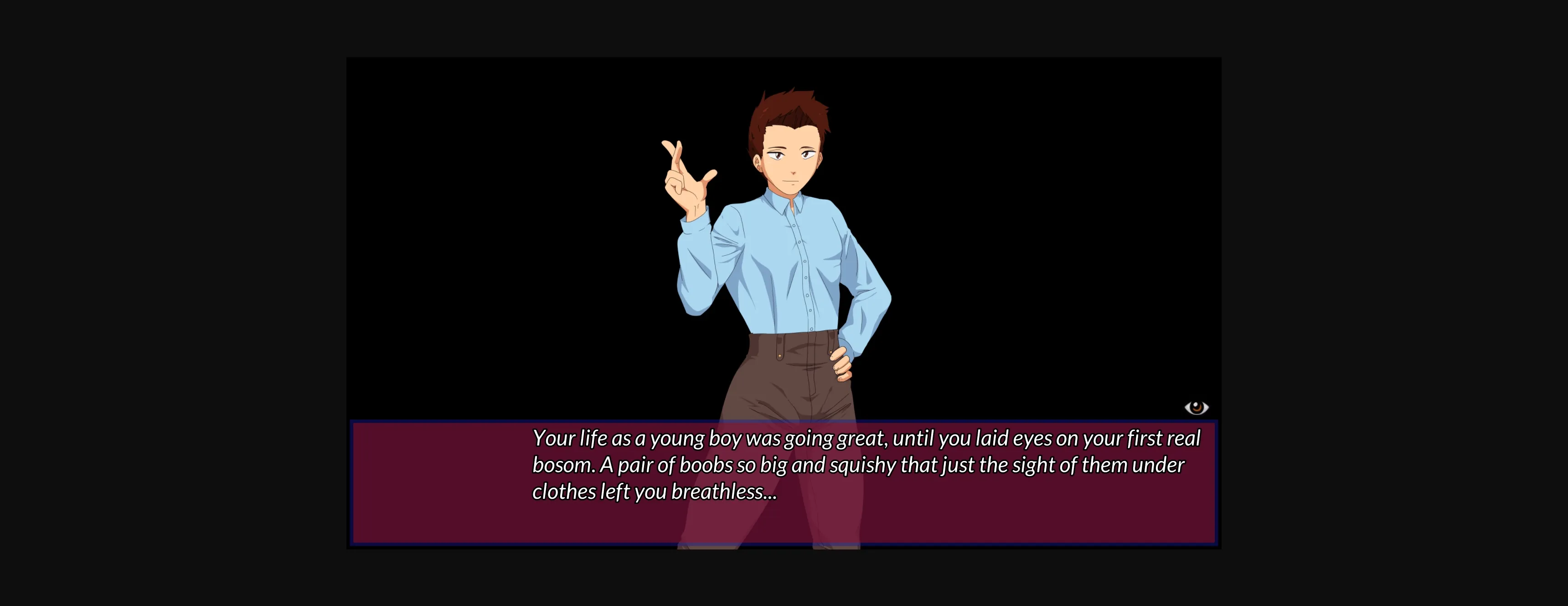 You play as a boy who is diagnosed with an incurable disease: Breastophillia. A disease that caused the sight of breasts to take his breath away. Literally. After word of his affliction spreads to the local youth, fears of spreading the incurable disease throughout the town. He leaves his hometown and old life behind to become an adventurer.