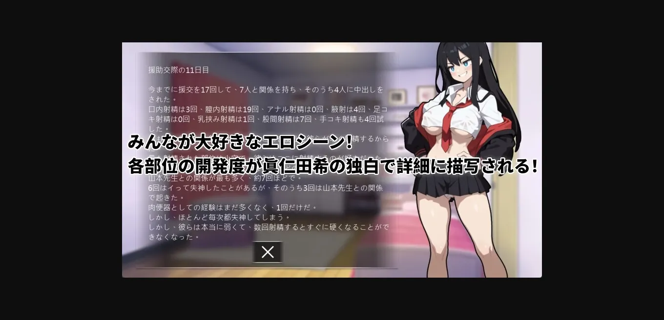 Manita Nozomi, an ordinary female student. With a competitive and unwilling-to-lose personality, she was one day led into the world of Enjo Kosai by a friend… Enjo Kosai… For an ordinary female student, this seems like a distant world. However! Ordinary student Manita Nozomi, due to a chance encounter, was dragged into this bizarre world by her friend! At first, it was out of curiosity and the need for pocket money, but gradually, she discovered a unique pleasure and sense of fulfillment in this world. To prove her worth (perhaps more for the pleasure) and to earn more pocket money, Manita Nozomi decided to go all out, constantly challenging herself, and eventually became the number one on the enko intercourse ranking list—the Queen of Enko!
