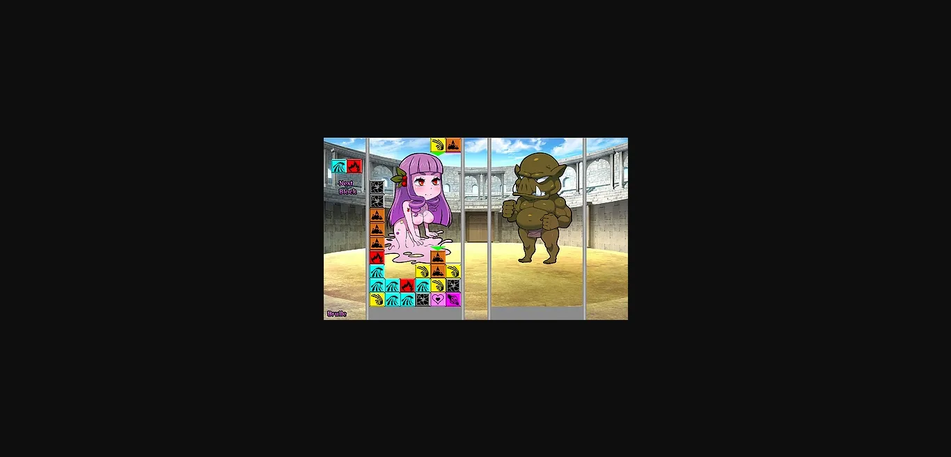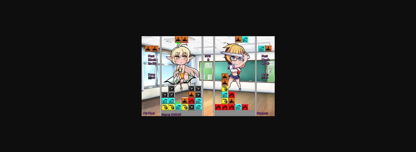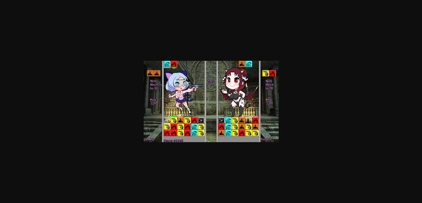 A cutesie 2d Puzzler where you compete against the CPU; Loser gets humiliated! Tetris…-ish style gameplay where dropping certain kinds of blocks onto others destroys them, and you have to keep them from reaching the top. To the victor goes the… non-penetration. Several different gamemodes available.