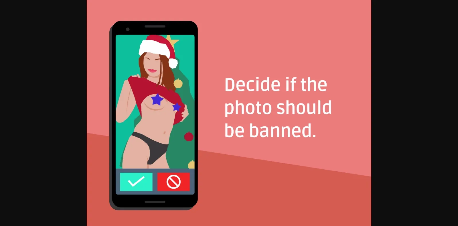 This is a short Android game where you play as a content moderator, your job is to look for & remove lewd selfies. You’re shown a mix of Christmas-themed photos & have to decide if it needs to be removed according to the strict guidelines your boss gives you. You’ll see lewd illustrations mixed in with selfies.