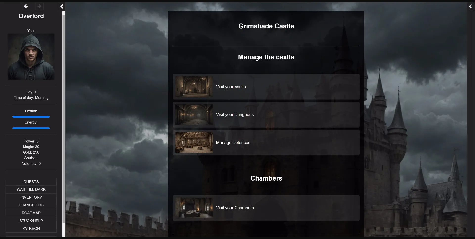 Overlord is an interactive HTML game where you play as a sorcerer who has returned to their abandoned castle. The goal is to explore the surrounding area, capture and corrupt villagers, defend your castle at night from raids and visit dark crypts and caves. The game uses AI art for characters and world building, but all scenes are with real people