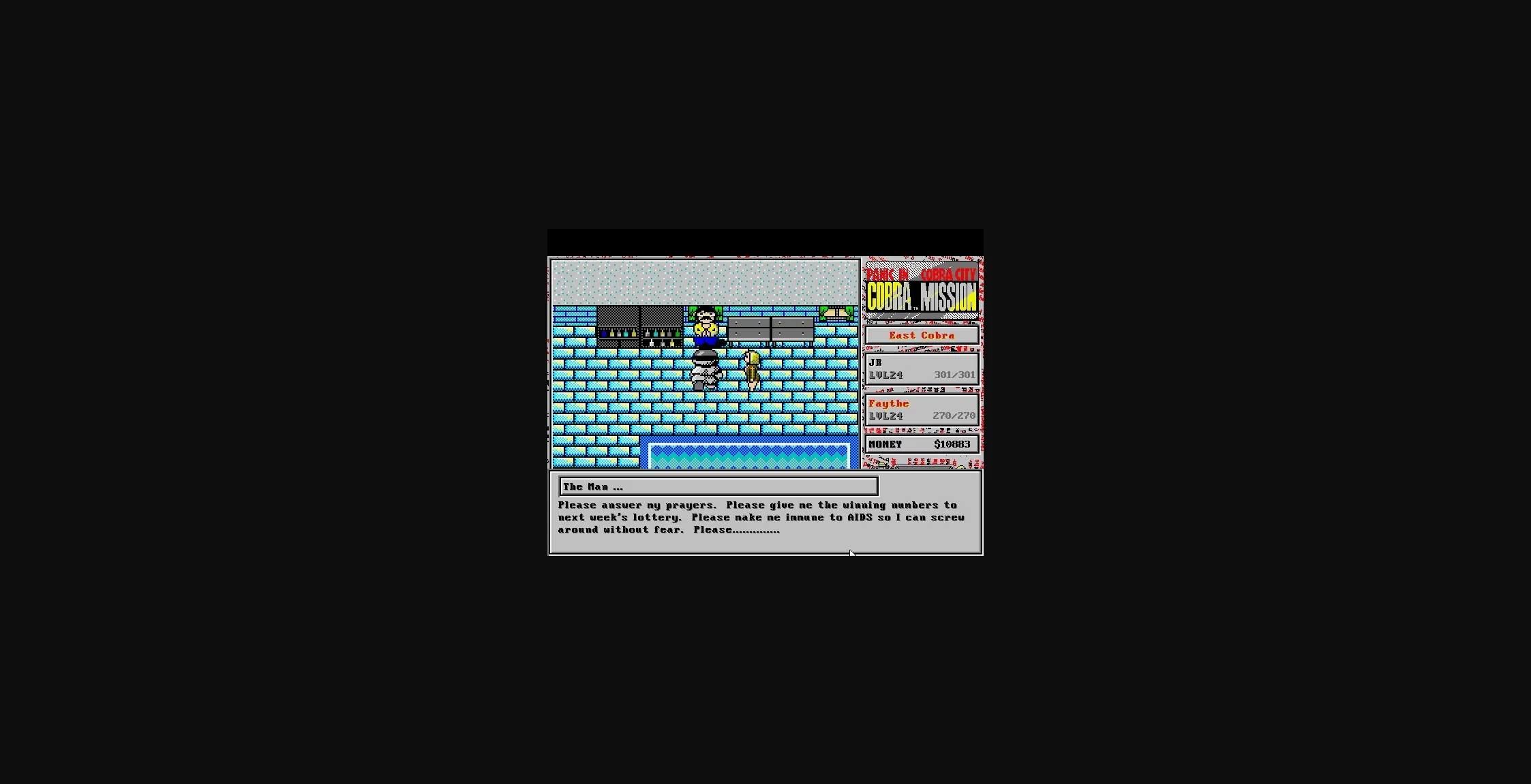 Your name is JR(or you could use your own name) and you’re the sharpest P.I. this side of Florida. An unexpected call from Faythe, an old flame and school buddy, sends you to Cobra Island off the Florida Keys. Her friends have been disappearing left and right and strange things have been occurring there as well. Rescue Faythe’s friends and they’ll reward you…very well. Find out who this Kaiser character is and restore Cobra to its formal tranquil pleasure resort it’s known for.