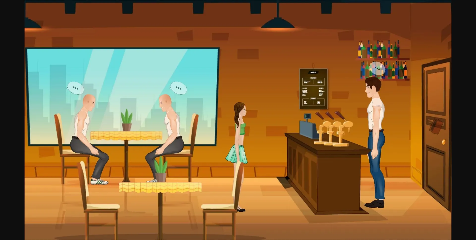 Jane can serve bald guys (repeatable), if she didn’t prevent them from going to Bar. 3 different scenes.