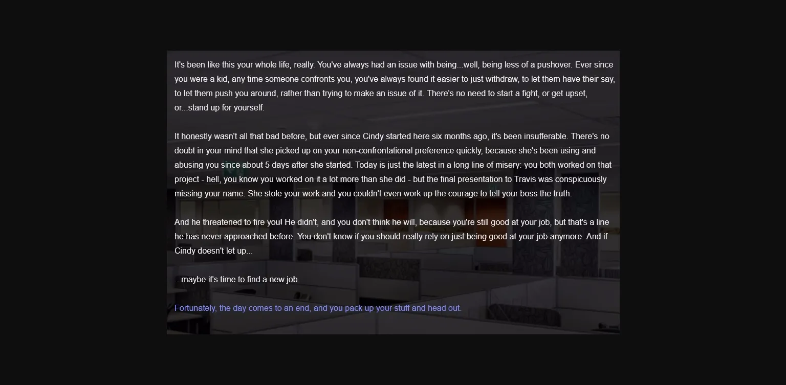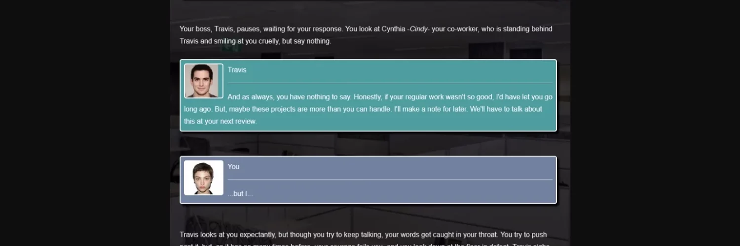 – When you’re talking to Cindy at work, you can still give her drugs even after you choose another option. This is intentional, because there’s no other option to drug her regularly, so it’s just for gameplay convenience.