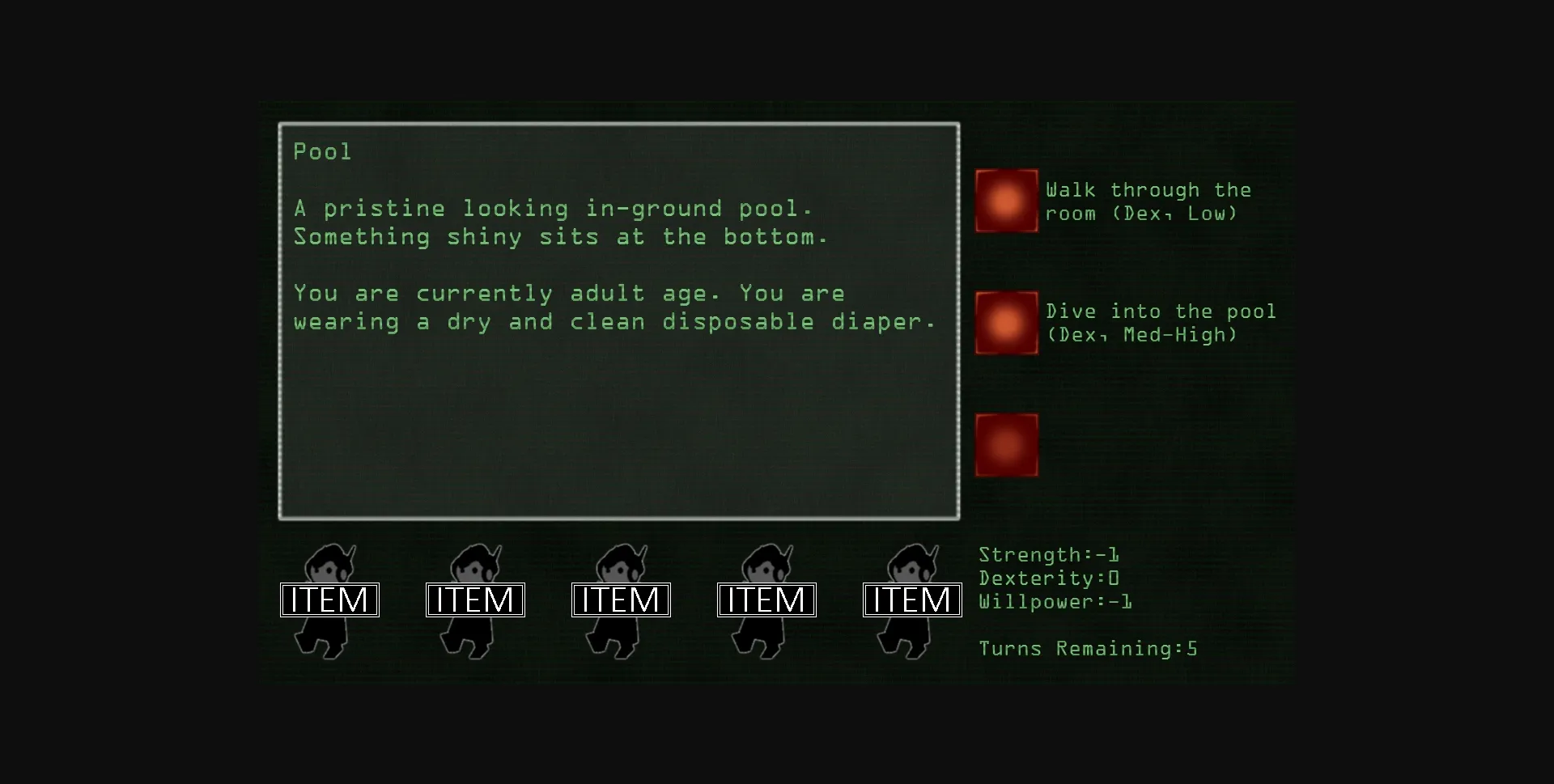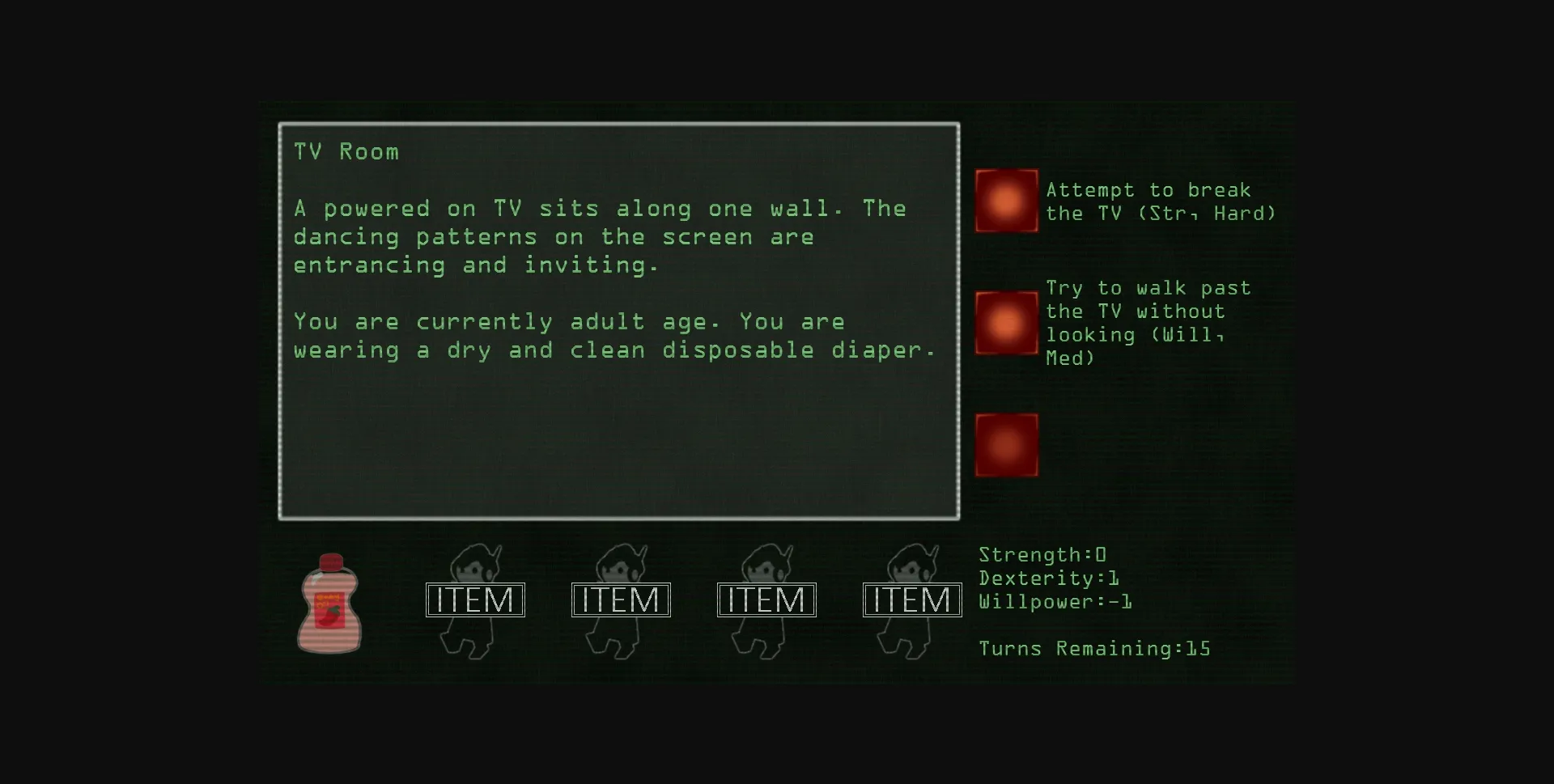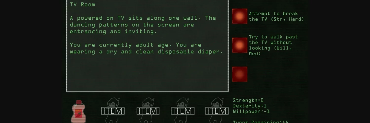 Robo-Nursery is a spinoff of Robo-Nanny in both tabletop card game/RPG hybrid (think Chainsaw Warrior or Betrayal at House on the Hill) and text-based PC adventure game form. As a single player with a single six-sided die (or the PC version of the game), you’ll progress through a random dungeon. In the tabletop version, you can also play with a party and a game host in a custom designed dungeon using similar rules.