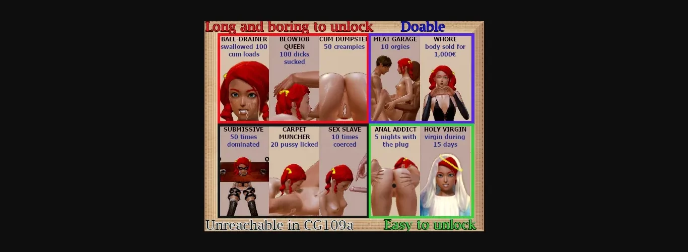 2D game, 3DGC, Female protagonist, RPG, Virgin, School setting, Tiny tits, Redhead, Urination (optional), Blackmail (optional), Groping, Voyeurism, Corruption, Exhibitionism, Sexual harassment, Drugs (optional), Bukkake, Handjob, Masturbation, Sex toys, Oral sex, Prostitution, Gloryhole, Titfuck, Vaginal sex, Anal sex, Group sex, Spanking (soft), lesbian (more or less optional), DP, gangbang, public sex , Clothes Changing, sandbox