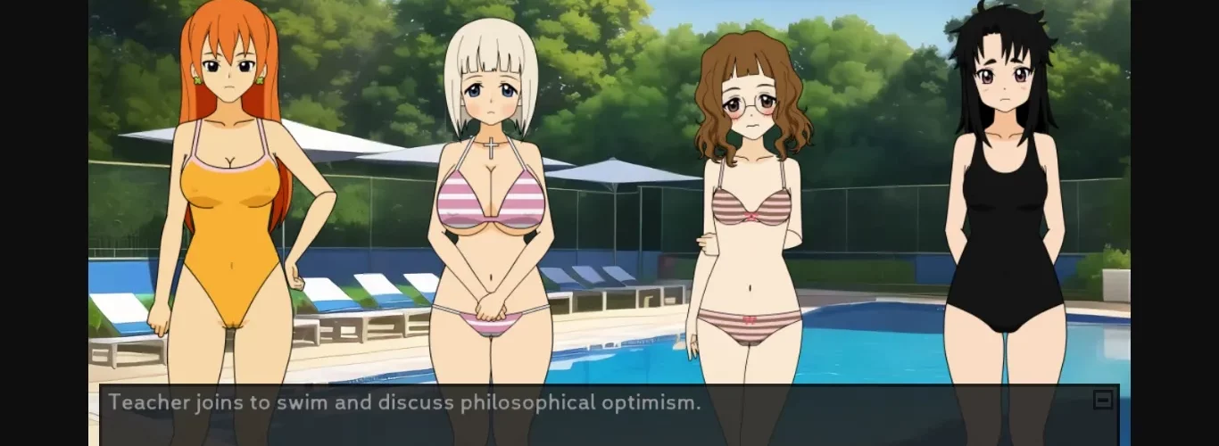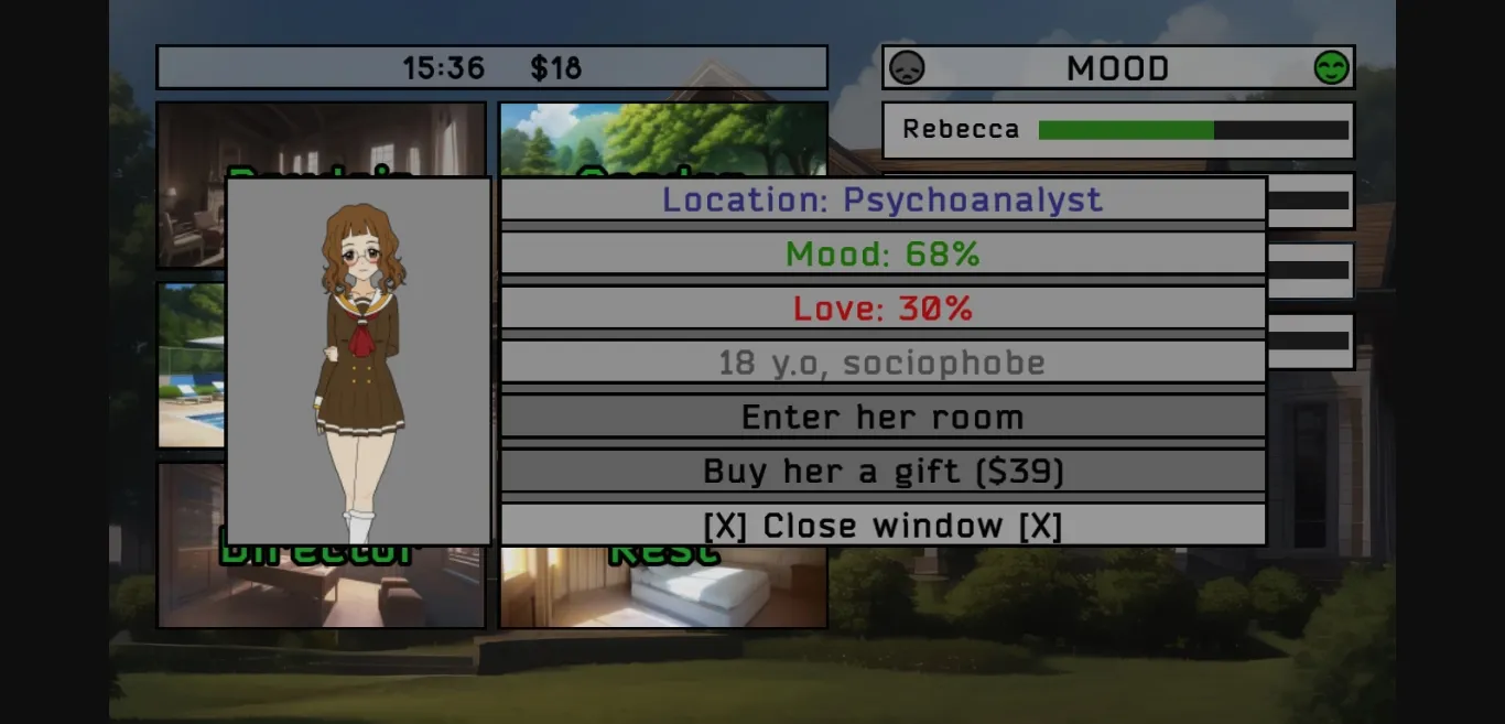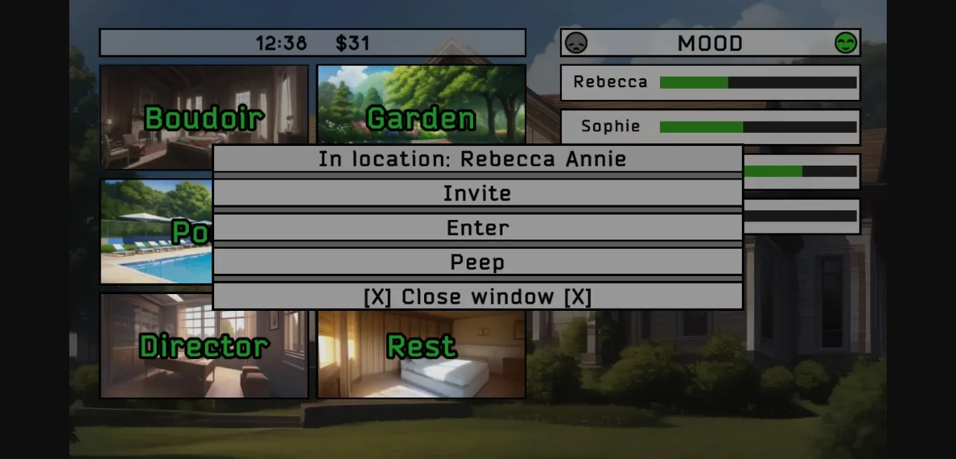 Lewd scenes v1: Sophie (bathroom + good mood), Eugenie (director + good mood), Annie+Eugenie (??? + bad mood), Rebecca (her room + bad mood + high love)