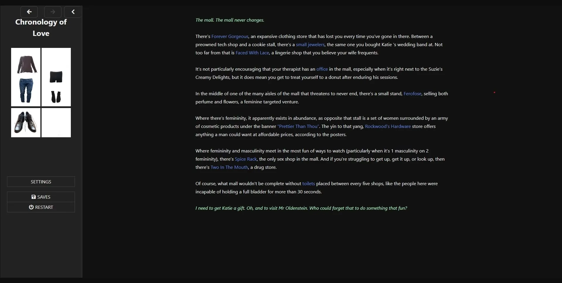 Chronology of Love is an erotic interactive fiction HTML game, revolving around the sissification of you, the protagonist.
