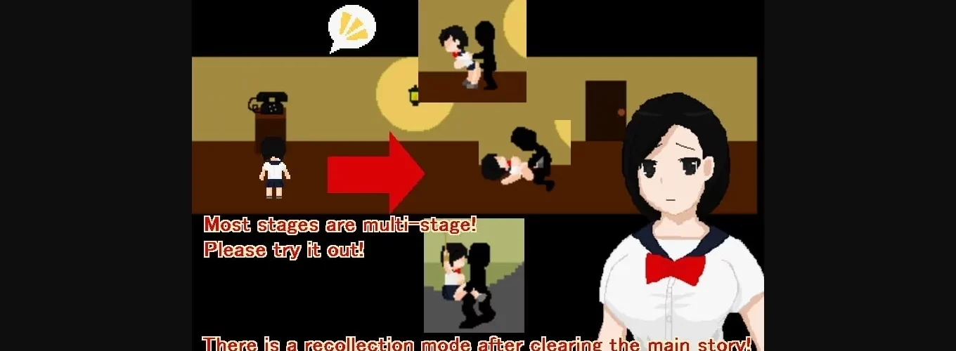 2D game, 2DCG, Female protagonist, Censored, Japanese game, Horror, Pixel/Retro, Reverse Rape, Humiliation, Nudity, Vaginal sex, Multiple endings, Group sex, Tentacles, Vore, School girl, Animated, Voiced, Adventure