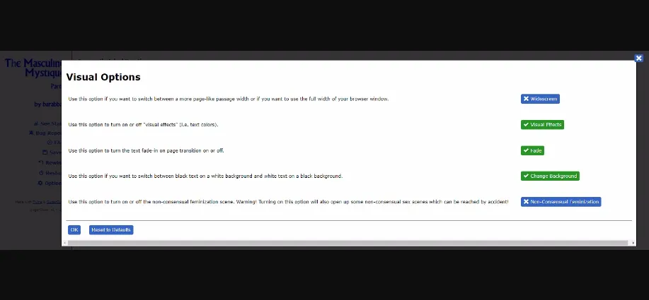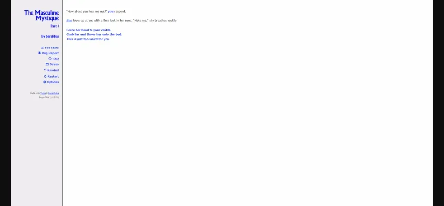 This game’s focus is on male to female gender transformation and no other types of transformation will occur in the game, even if requested (since it wouldn’t fit into the logic of the story’s universe). The game is certainly X-rated, probably XXX-rated. There are quite a number of sex scenes in the game, though it is possible to play through avoiding all of them. The story is now almost 280,000 words long, which is the size of James Joyce’s Ulysses (though one playthrough won’t get you a story nearly that long).