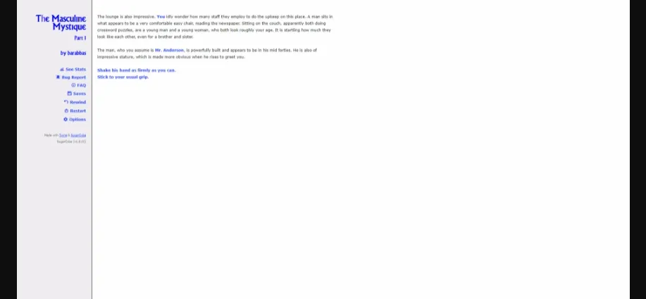 The name of the story/game is The Masculine Mystique. It was written in Twine, but you don’t need to download anything to play it. It plays in your web browser and should play in any web browser. (UPDATE: There seem to be a problem with IE8 and I don’t know how to fix it. Upgrade to IE9 or try Firefox or Google Chrome or another browser and hopefully you’ll be able to play it.) It’s more of an interactive story than a game, though it does include a lot of gamelike elements. (The story tracks statistics which I currently allow you to see when you’ve finished playing through along with an explanation of how they are used.) These statistics have the effect of occasionally opening or closing off options to you or determining the result of a choice. So, for example, if you try to order somebody to do something, but your dominance stat isn’t high enough, you won’t be successful. Or you might refuse to do something, only to find that you’re too highly submissive already and no longer have a choice.