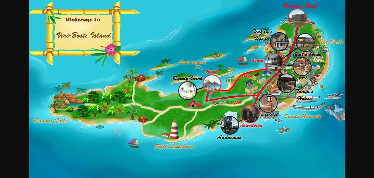 You play as a young, muscle-bound, horse-hung boy who moves to a new home on the tropical island of Veri-Bosti with his mom and sis. There, you are challenged by the local school stud to a duel: whoever fucks the most girls in a week will be crowned the undisputed school stud. Your aim is for each girl to reach "Epic Lust" so that she is primed for the taking, before your AI challenger gets inside her panties. And hence begins the epic "Battle of the Bulges".