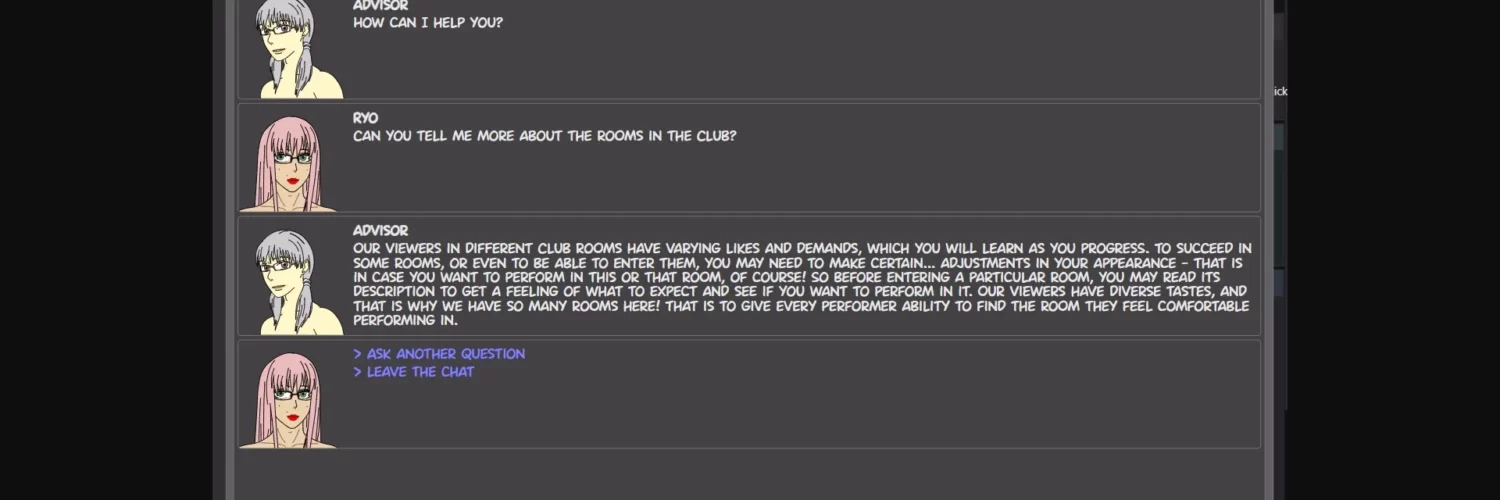 • A help screen was added for the dating game. It will automatically show up when the player starts the date for the first time, and can also be toggled anytime during the date.