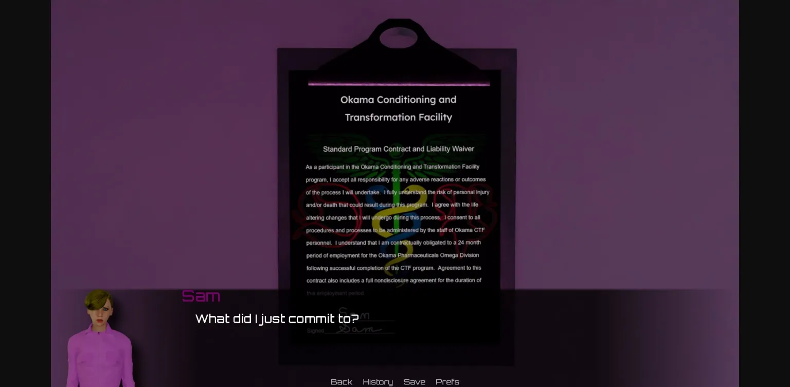 En-Fem-E No. 9 – The Factory picks up where the previous game left off. The MC finds himself in a corporate prison facility run by a nefarious company call Okama Pharmaceuticals. The MC must endure a conditioning treatment enforced by Okama. Okama is conditioning and transforming the MC to act as an agent for their master plan. The MC is eventually released into the world to collect semen (DNA) samples from target subject so Okama can finish their titular formula En-Fem-E No. 9. Porn star Autumn Rain makes a guest appearance in the final portion of the game.