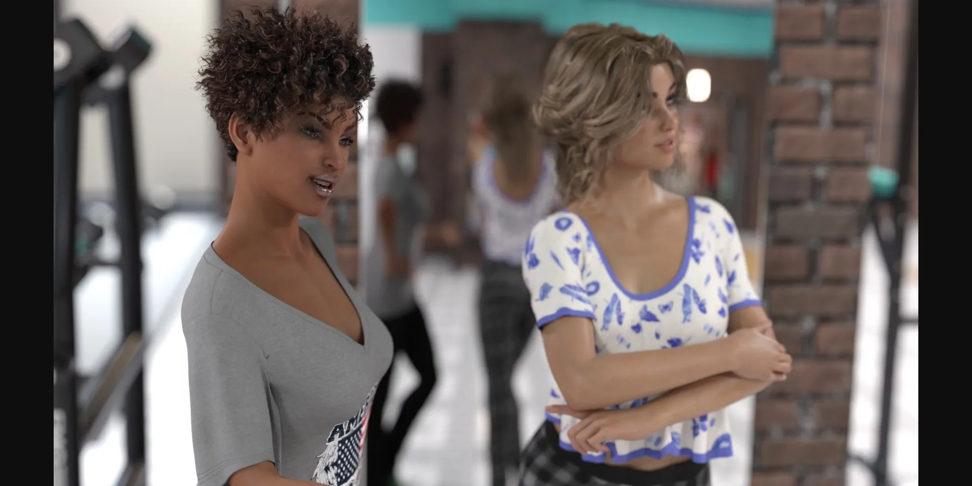 Sunset Bodies began development in January 2020 as a short form drama scripted for traditional media . As of February 2020 travel was shutting down our non-adult projects were shelved. Then it languished as a script until mid-2020 when an artist was sourced. After some issues with early renders we requested the artist from Angel Tower review the script and found our design. It was the decision of Scrambled Channel Games to delay the release of Sunset Bodies until the world was returning, closer, to normal. Early designs had characters wearing masks, location changes, & even the realistic idea that Gyms had closed.