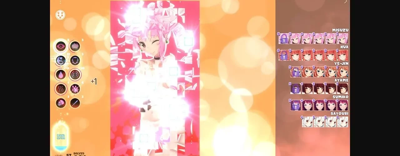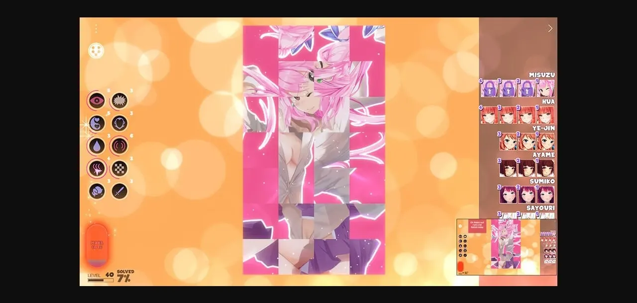 Undressing puzzle game! Match the pieces and unlock new stages, each with less clothing. No need to move pieces around, just rotate them! Use abilities to solve puzzle quicker. All the girls notice what you do and comment on your progress.