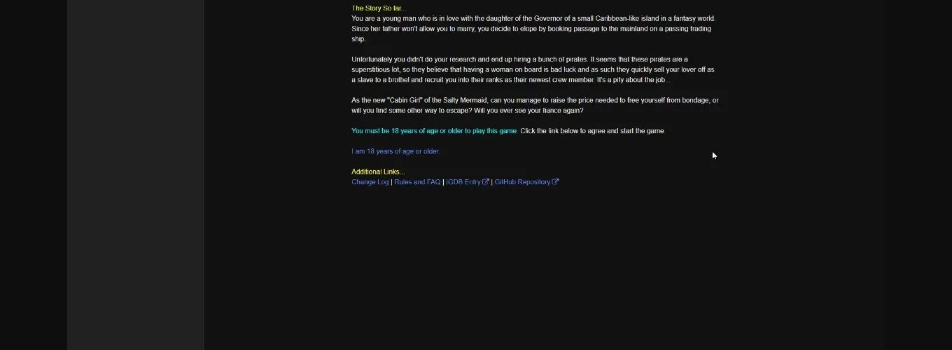 Queen of the Seas is an RPG with heavy non-consentual themes. You play the role of a young man who elopes with his lover in the middle of the night. Unfortunately, you booked passage on a ship full of pirates and they quickly enslave both of you. After selling off your girlfriend, they decide to keep you on board as their slave "Cabin Girl". Can you survive and win your freedom before your mind breaks?