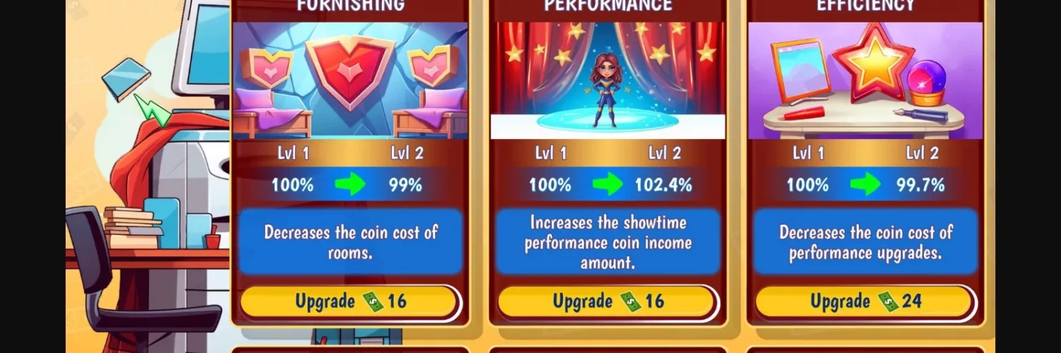 Tap the streamers to collect money, upgrade their spots so that they can entertain the guests even more and earn more money. After a time you will be able to automatize this process, freeing up your hands to do something else… for example to hire new streamers to do new functions in the club, or to help them to provide special services to the customers in one of the back rooms.