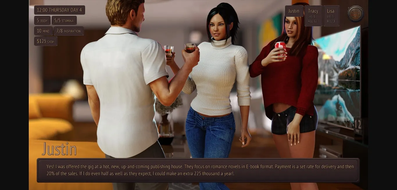 LIVING WITH TEMPTATION is a sensual relationship simulator in which you need to balance your love for Tracy, your wife and your desire for your nanny, Lisa. The game was initially released in 2013, and then in 2021, we prepared a remodeled version with new renders and more content. Now, over 10 years after the original release, we’re presenting to you its evolution, AMERICAN SUNSET.