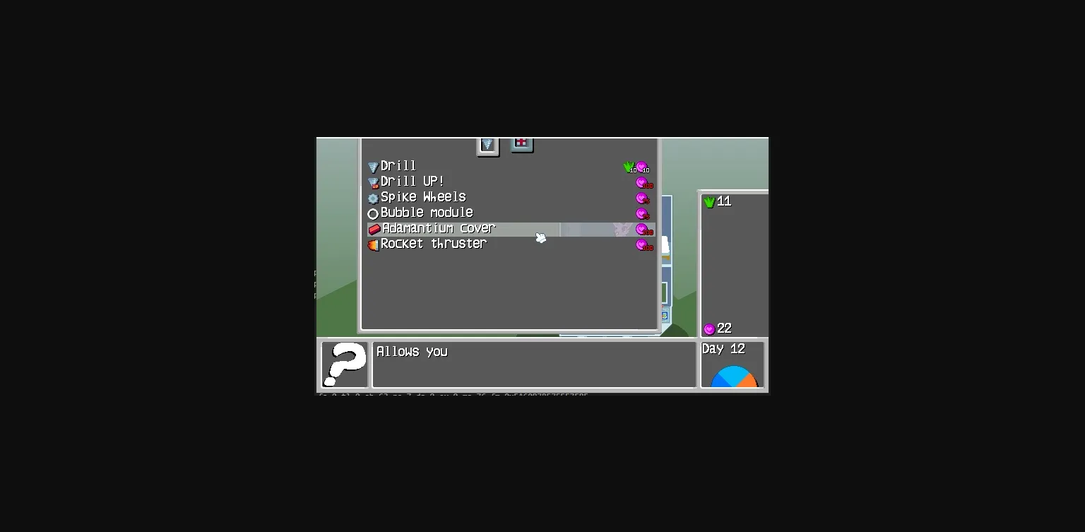 The gameplay consists of harvesting resources and girls from the world map! placing drills in biomes getting access to upgrades to get to new biomes, new biomes containing new girls, getting a girl to love you will eventually grant upgrades to make your journey easier.