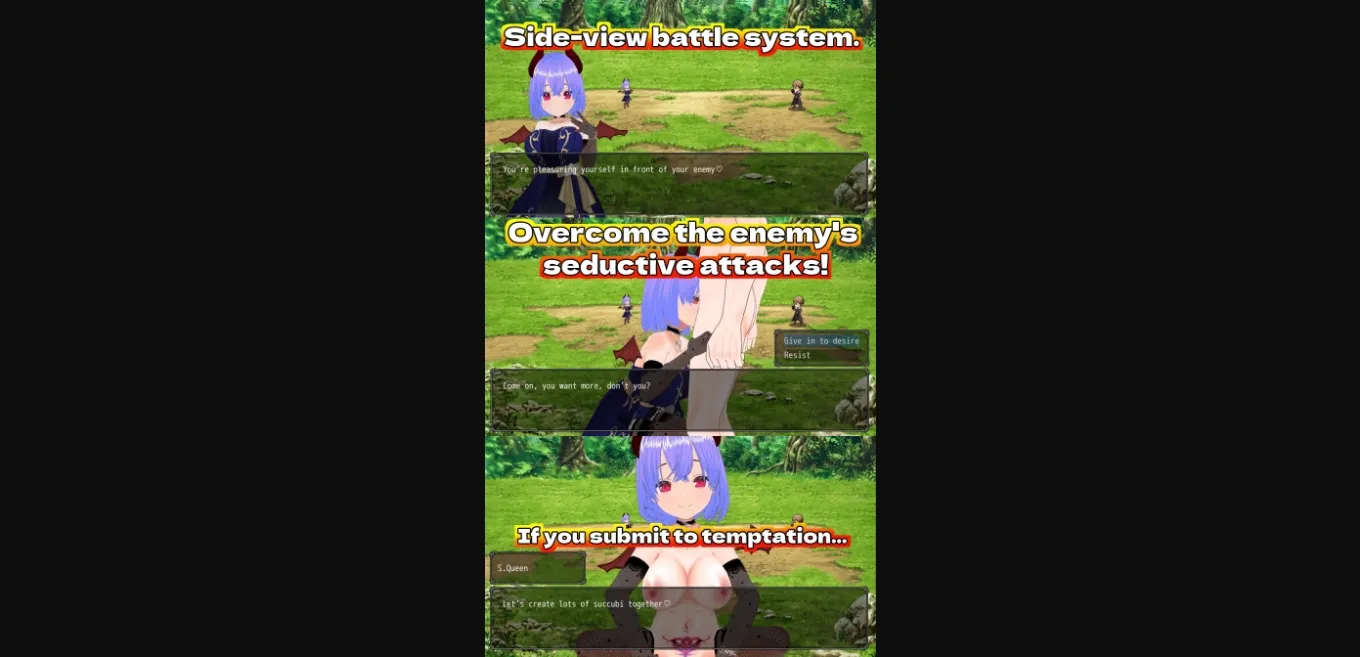 Battles are in side-view format, where you fight while resisting enemy seduction attacks.