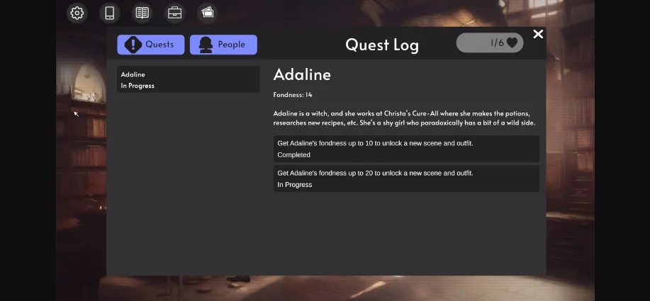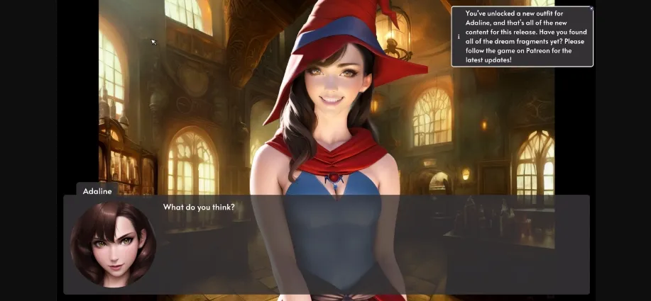 * The story continues! Talk to Fiona after the sex scene with Adaline in the apothecary to see what happens next. You may need to repeat the sex scene with Adaline if you’re playing from a save file. I (stupidly) didn’t add a flag in the last release when you finish the sex scene, so the game thinks you haven’t done it yet when you resume from a save. I’ve added a flag in this version, but it’s too late to help old save files.