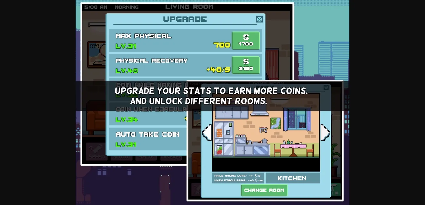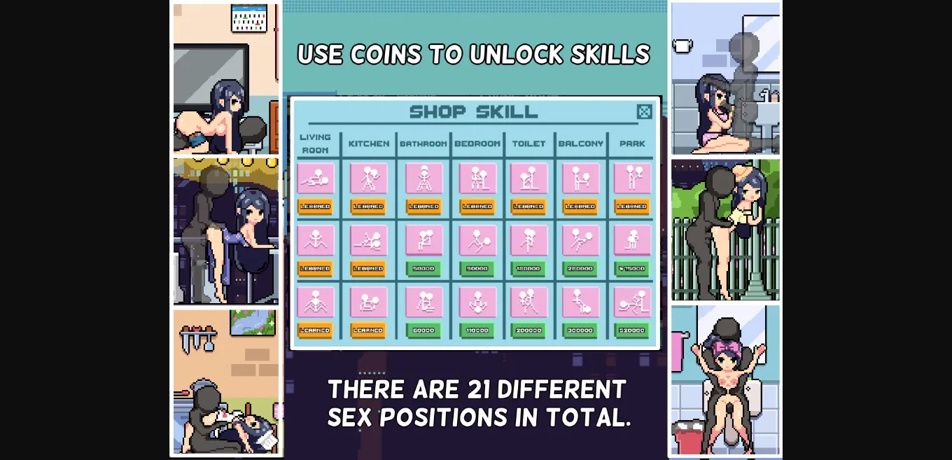 – Use coins to unlock new rooms and new sex positions.