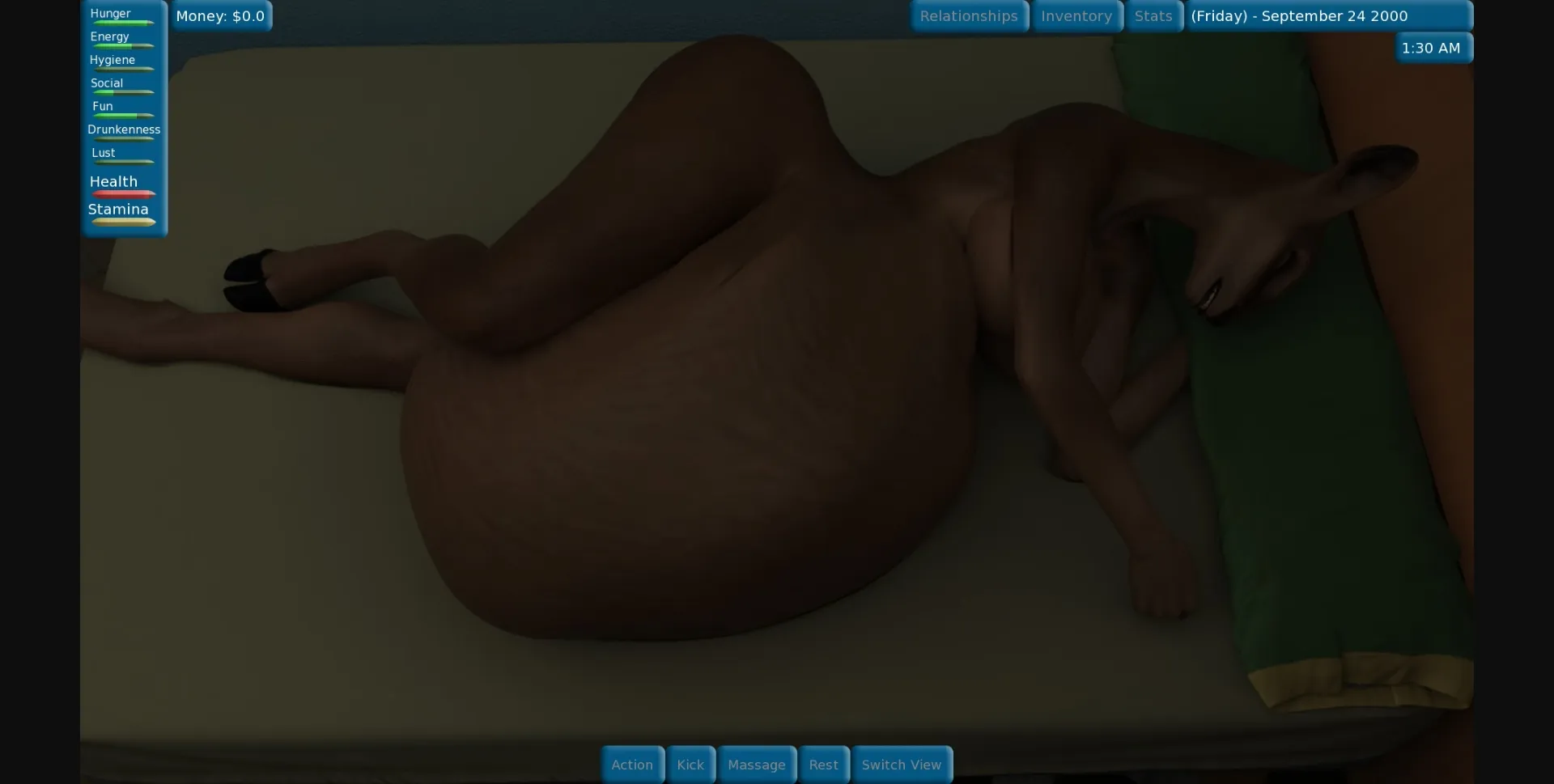–Added appropriate arousal changes in "bed time" scenes with Jasmine, and made the latter scenes less likely to be fatal (with smothering to death) for any player character with 10 or less "Luck" stats (in fact, the scenes were pretty much impossible to get unless you got a stratospheric luck stats)… Gave a bonus to belly sluts for such vore scenes occurrence.