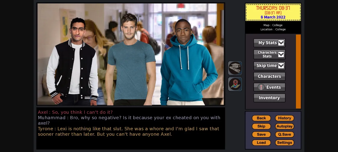 Hello, the project is onhold and will never be dropped. If you played the game you already knew that there were fighting scenes and a mini game. Googling for the correct images and photoshoping it to match the scenes and to match the video clips that are used took too long. I hoped to buy new hardware and use 3d models to do the actions. So, I’m putting this project ONHOLD. There will be a new 2D game as I have been practicing 2D art. Not AI. Hand drawn digital art. I plan on doing it and once I buy a good gpu I will restart this along with the 2D game.