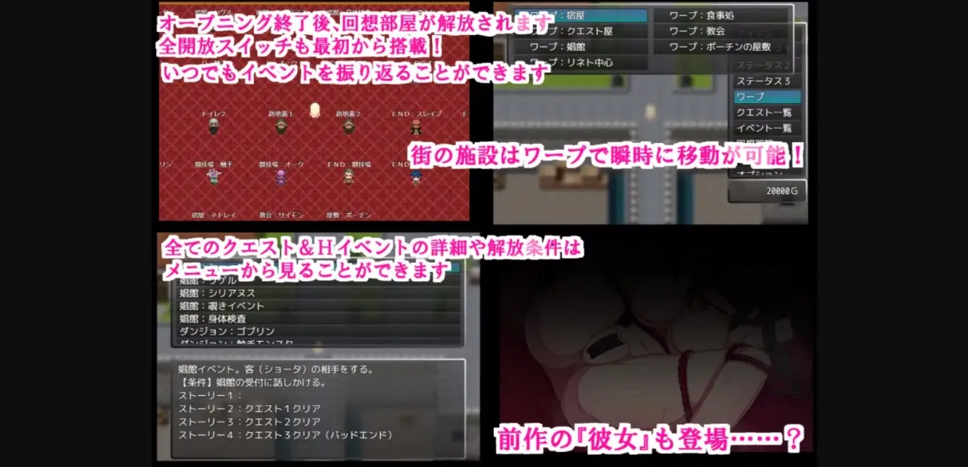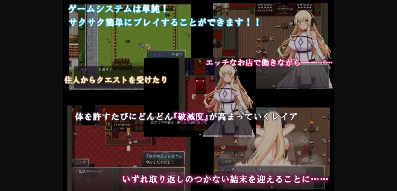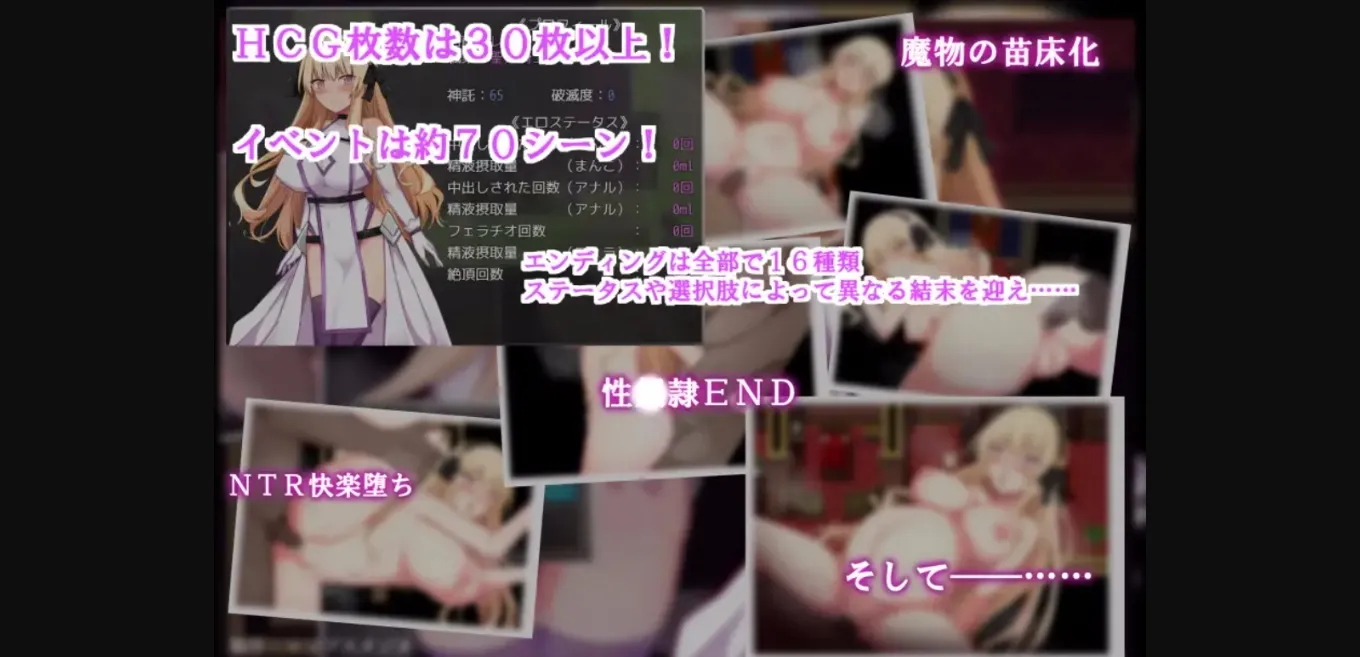 2D Game, 2DCG, Censored, Japanese Game, Female Protagonist, Multiple Endings, Voiced, Anal Sex, Ahegao, Big Ass, Big Tits, Blackmail, Bukkake, Corruption, Creampie, Dilf, Group sex, Groping, Handjob, Humiliation, Male Domination, Multiple Penetration, Oral Sex, Pregnancy, Rape, Shota, Tentacles, Adventure, Fantasy, Mind control, Monster, Turn based combat,