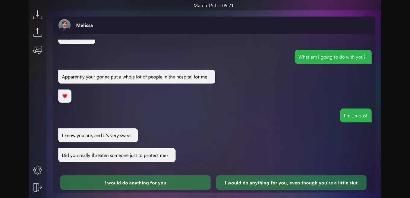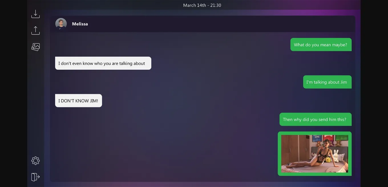This is a story-centric game that is played entirely in a text application, where the player gets to talk via texts with Melissa about her decisions, her life, her future, and, on occasion, her selfies.