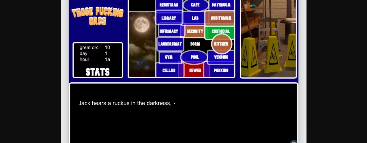 Welcome to Jack Gates, Those Fucking Orcs. You, the player, play Jack. Jack is a night watchman in a university built on Tolkien Estates. He must rid the school of those fucking orcs before it’s too late.