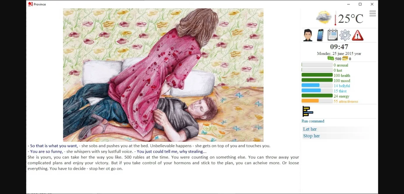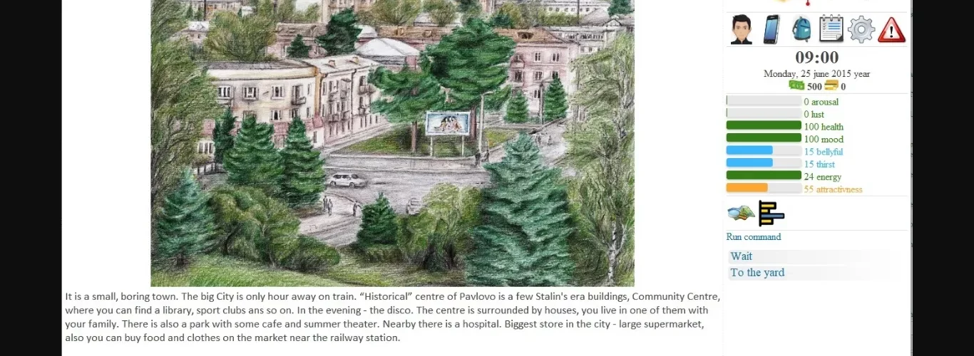 "Province Guy" game is a mix of sandbox and visual novel, depicting life of an ordinary young guy somewhere in Russian province. He lives in a small town, with his family – a father, brother, father’s wife, and the wife’s daughter. This young guy is just turned 19, and is making his first steps into adult life – which is full of joys, but it can be also dangerous. Help him to become a man!