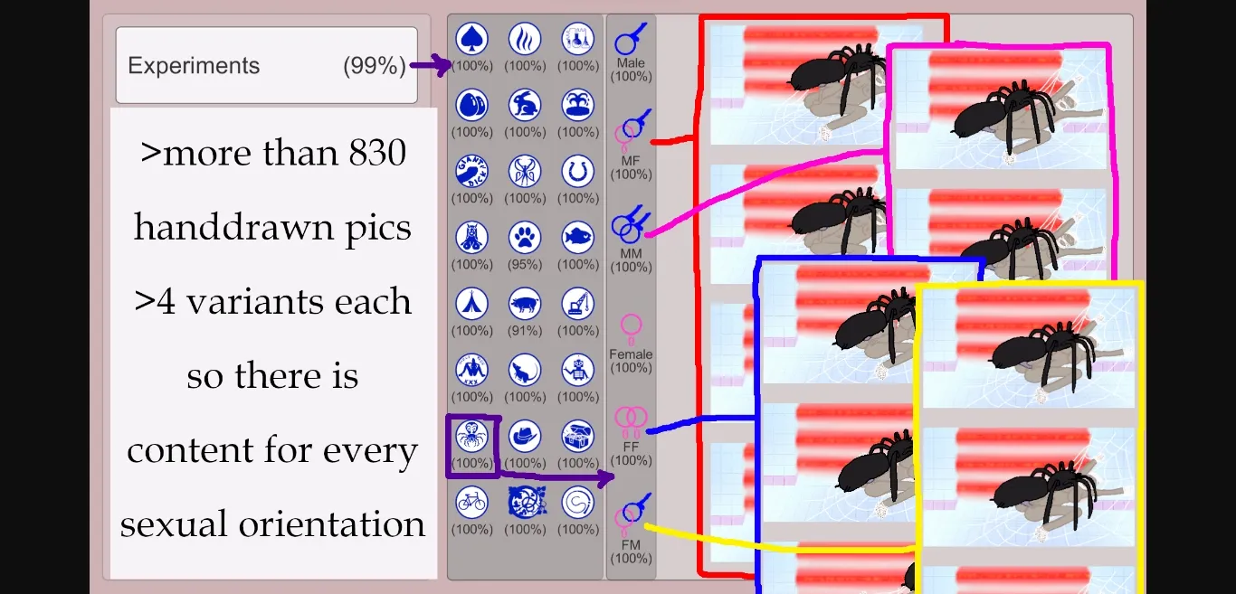 Most of the content is handdrawn by myself. Well I used some pics from Rule34 as base for my drawing (I redraw and compose them) for the ending scenes.